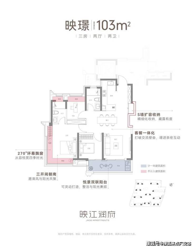 建筑面积约103㎡三房两厅两卫,不失为改善家庭的首选。其中边套户型,映江润府的主卧套房 做了 270°环幕飘窗, 实现无与伦比的采光通风和视野享受,类比于千万级豪宅的体验!