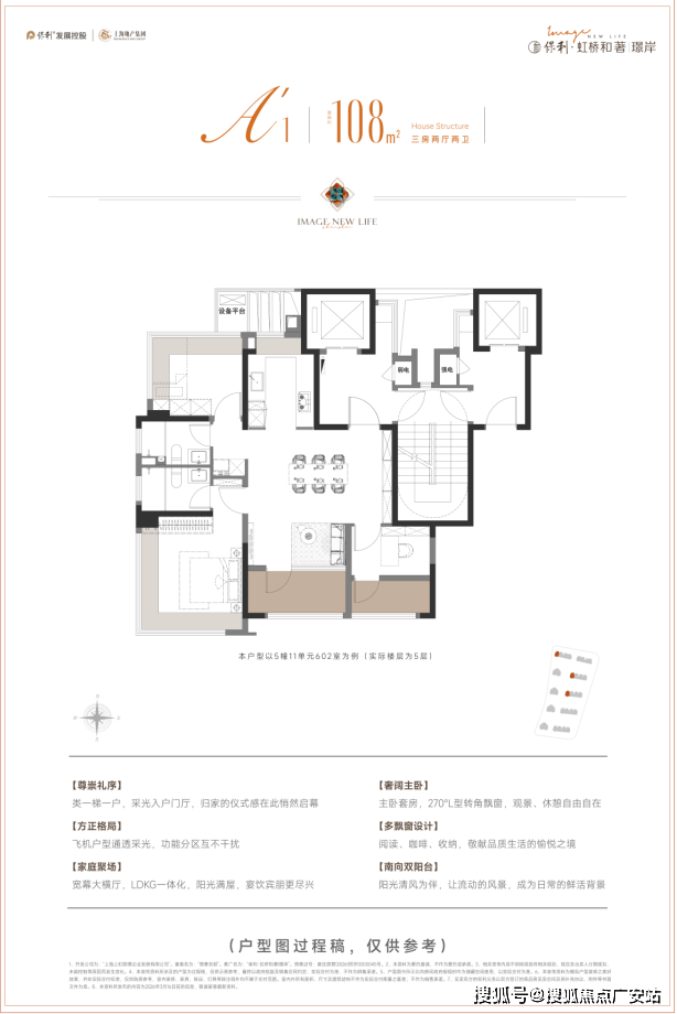 一梯一户、全明梯厅、双阳台、约 270°转角飘窗 ,几乎找不到短板,三口之家住得宽松,三代同堂也不会局促。
