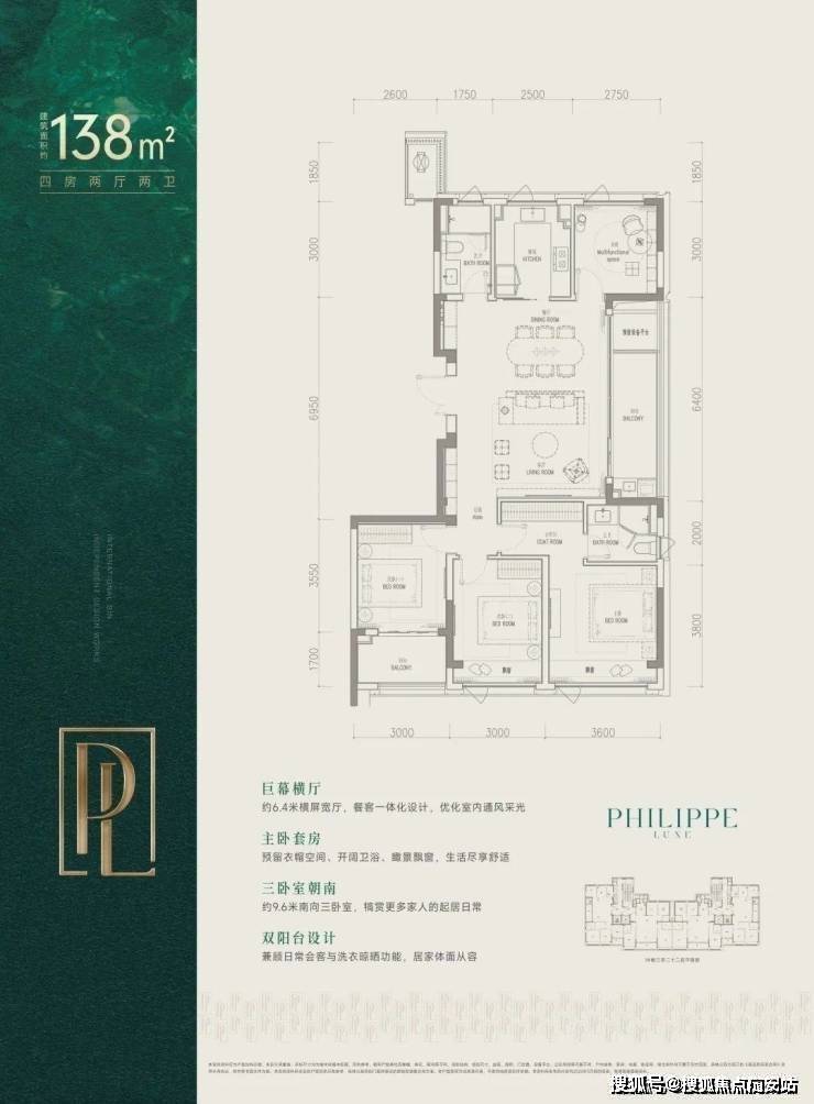 户型方面共有两款可选,起步户型为建面约138㎡边厅户型,四房两厅两卫,两梯两户,三房朝南,双阳台设置。