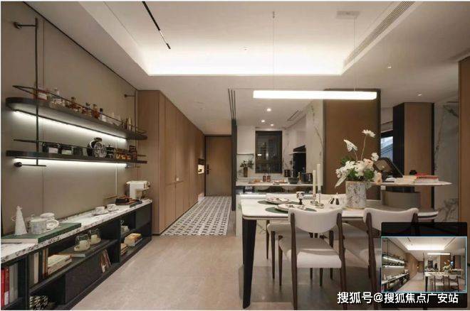 其中,餐厨系统的进阶不只在于橱柜、拉蓝等细节的收纳,更在于映江润府引入创新的S墙,可以轻松将冰箱移出厨房,同时保证视觉效果的整体性。