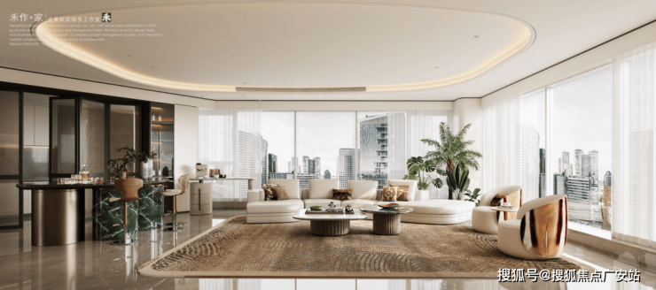 将艺术感进一步融入日常中。特别设计的专属门厅空间,是从电梯厅延伸到家,如同一处艺廊,放慢人的情绪;室内选用了浅金色奢石(外界也称其为“芬迪白大理石”)作为主要的石材,曲面的木饰面也为浅色,整体给人以明亮感。