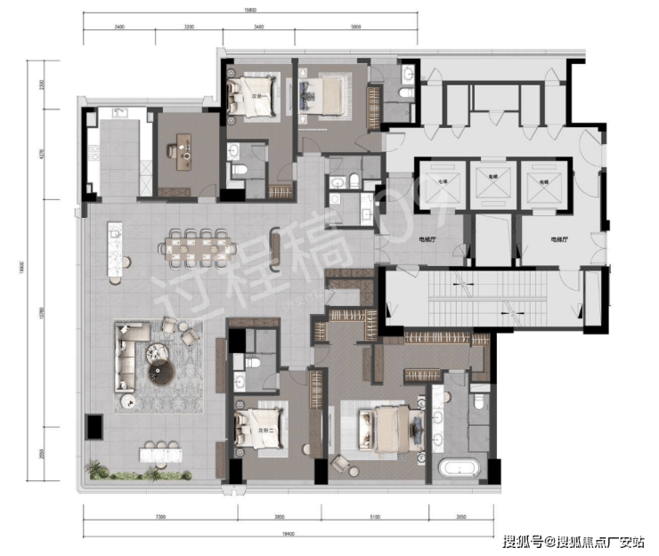 公区方厅第一眼的感觉就是辽阔,建筑面积超90㎡,想举办超大型party都没问题,并且南向开间有约19米,这样的尺度能和市面上四五百方户型的客厅媲美了。