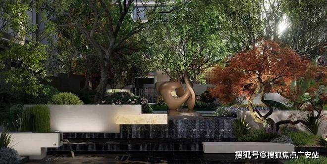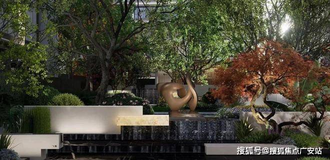 ③一心:中心高定典藏花园,沉香米黄石+蓝钻花岗岩流水面搭配透光云石,奢华氛围营造;花园廊亭将中心花园四季风景、潺潺流动的水景尽收眼底;