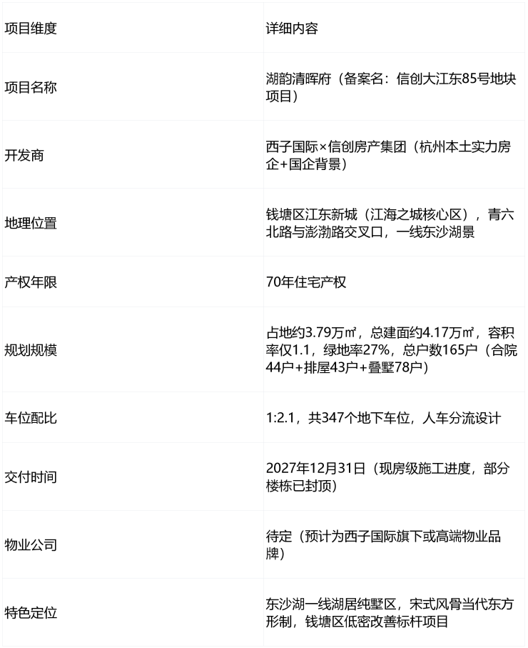 湖韵清晖府最大价值在于一线绝版东沙湖景+1.1超低容积率纯墅区+宋风顶豪品质+本土豪宅专家打造的组合拳,既享受东沙湖与江海之城的生态资源,又坐拥城市核心配套与发展红利,是杭州高端市场中不可多得的“城芯湖居低密传世资产”,特别适合追求生活品质、注重生态环境且需要便捷城芯生活的高端家庭。