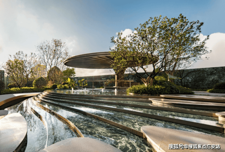 12级叠水、2座树池、9步水上汀步,运用六重造景手法打造近500平中央水景。
