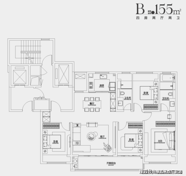 155㎡四房两厅两卫:一梯一户设计,私密性高,独立外玄关入户。南向四开间,三卧朝南,南向双联阳台。主卧也是套房设计,带衣帽间和内卫,且带有浴缸
