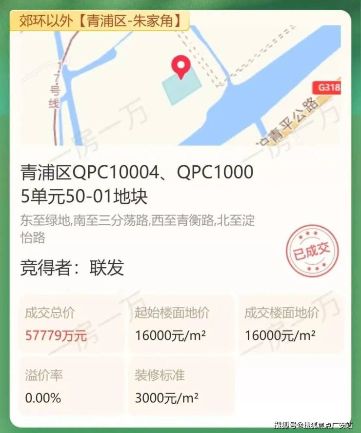 7月24日,第六批次土拍首日,联发以总价219480万元竞得青浦区QPC10004、QPC10005单元47-04、49-01、50-01地块,成交楼面板价14925元/㎡。