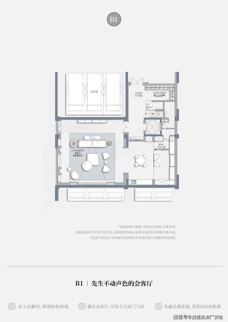 • 从容抵达步入地下会客厅,转角衣帽间换一身便服,轻松切换身份情绪