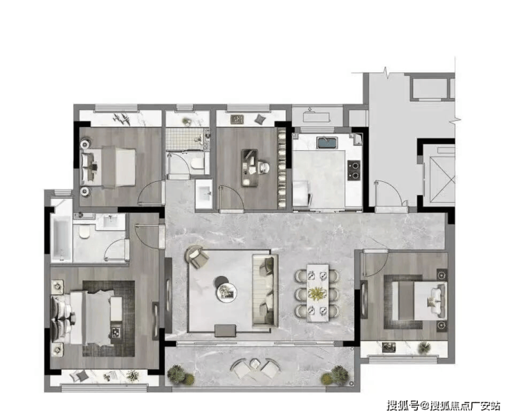 四房布局适配全龄改善需求,南向主卧套房自带独立卫浴,对改善家庭来说,这不仅是一间卧室,更是能卸下疲惫的“私人小天地”。