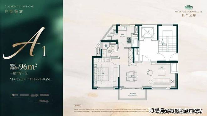 建面约96㎡1房2厅1卫户型▼