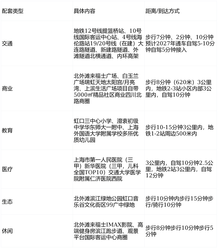 项目周边配套成熟,3公里内覆盖陆家嘴、外滩、南京东路三大顶级商圈,步行10分钟可达北外滩来福士广场。交通上,紧邻地铁12号线提篮桥站,未来19号线也将带来便利。教育、医疗资源同样丰富,虹口区继光高级中学(市重点)等名校环绕,新华医院等三甲医院为家人健康提供保障。项目由中粮集团开发,提供24小时管家服务和1800㎡私享会所,从建筑到服务全面保障居住品质。