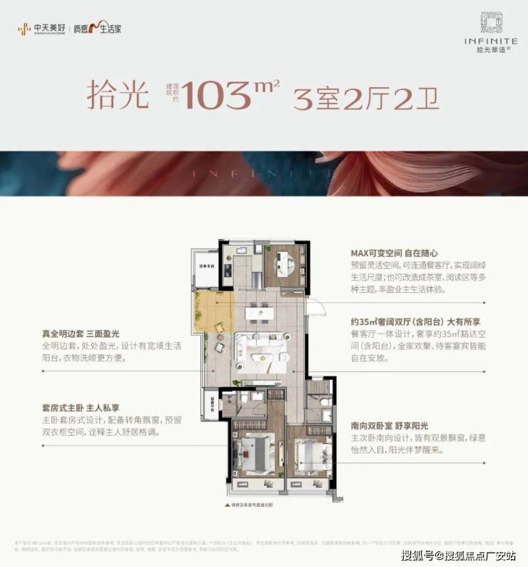 建面约103㎡的边套更是堪称神迹,将小户型的空间魔法玩到了极致。客厅到阳台的地面、天花直接拉通,甚至两侧的墙垛都已隐身,整个餐客厅面积达到约35㎡(含阳台),这可是140㎡以上大宅才有的空间感!
