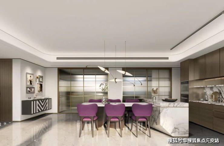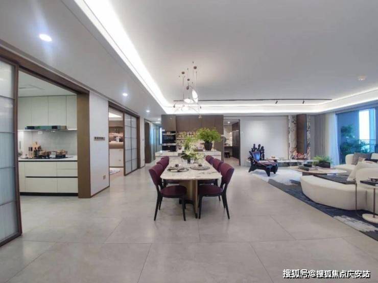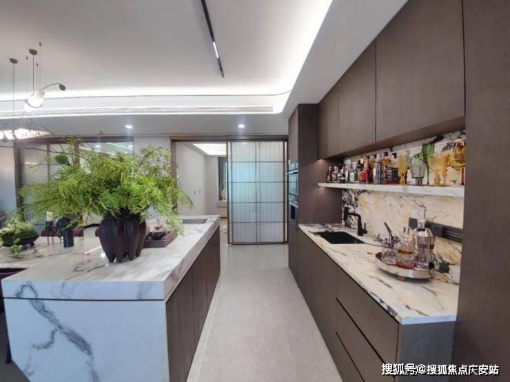 在客厅另一侧,连接客厅和厨房的岛台,LDKG一体化,进一步放大整个空间社交属性.营造N+种居家与聚会场景,让横厅的社交属性得到充分放大.