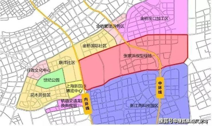 张家浜楔形绿地北靠金桥,南临张江高科技园区,西侧紧邻花木副中心,根据它的控制性详细规划公示,范围有明确界线:东至环东二大道(外环线),西至罗山路,南至龙东大道,北至锦绣东路。