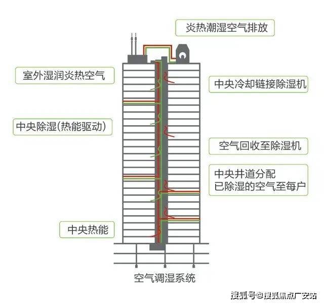除湿原理:室外高湿的空气被送风机吸入新风机组,遇到新风机组里的冷盘管(冷盘管里的7℃冷水,来源于中央能源系统的冰蓄冷系统),高湿空气的水分子被稀释出来,冷凝水滴到积水盘,再通过排水管排出去,留存下来的就是低温干燥的空气,送入室内。