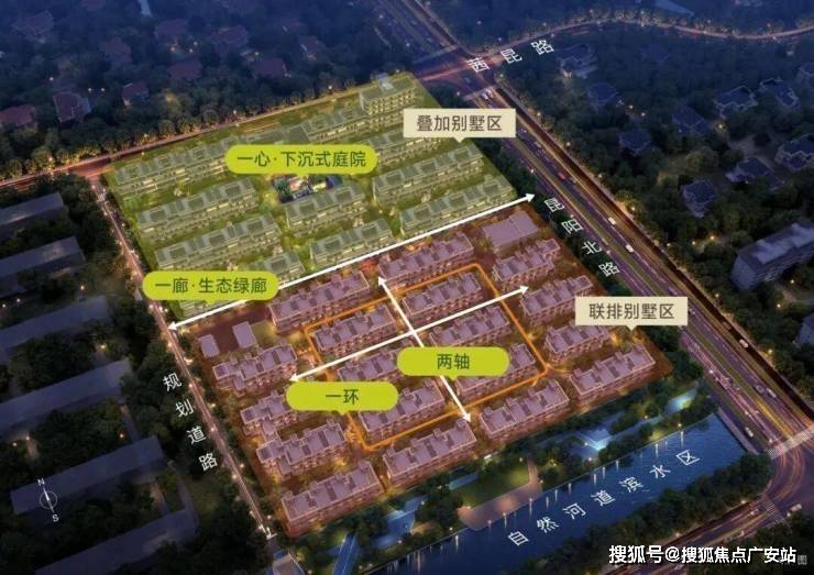尚园整个地块方正,以滨水森屿的围合界面。以东西向绿廊“一廊”为界,北侧四叠墅区,南侧联排别墅区。北侧以下沉庭院为“一心”(中庭景观王座由来),中央开放式空间,增强社区邻里交流的归属感。南侧“一环两轴”,强调“有天有地有花园”私人领地、领空绝对拥有感。