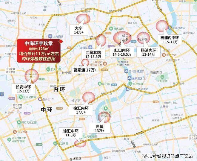 内环内新房普遍12万+/㎡,静安曹家渡约17万+/㎡、虹口14.5-16.5万/㎡;内中环如大宁14万+/㎡、长宁中环旁12-13万/㎡、浦东世博13万+/㎡。
