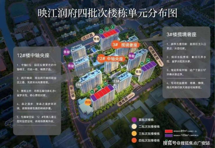 这次映江润府计划加推两个全新楼栋,12#中轴央座,落位项目中轴之上,尽揽五重归家礼序,对望【无界水院】与【童梦水院】星空戏水池。3#揽境奢座,近园区归家主入口,奢藏五重归家礼序,从容赏景,步步皆礼。优越的楼栋位置之上,享映江润府隐逸双水院,可以说优势都非常突出,就看谁是你更心仪的那个楼栋。