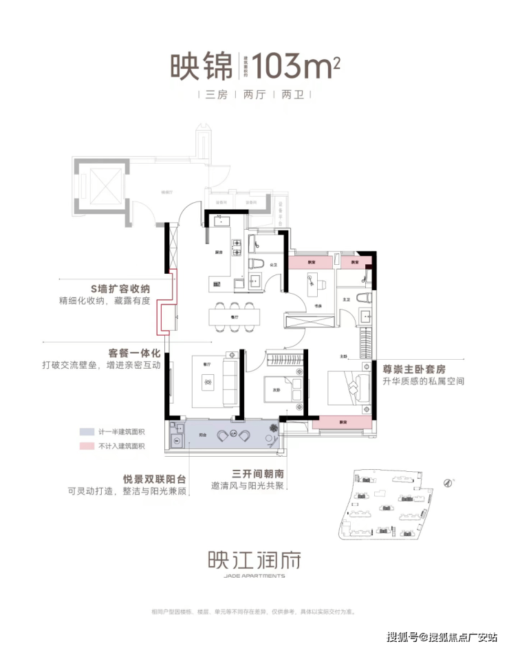 亮点五:双联阳台+多飘窗赠送、灵动空间。映江润府103户型,实现了100平级别难得的双联阳台,实现了室内空间的横向延伸,同时,搭配主卧、主卫、书房的“全飘窗”设计,赋予了空间更多灵动的使用场景。