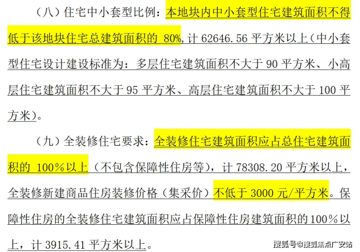 根据土地转让合同要求,项目规划住宅套数下限870套,中小套比例不低于80%,全装修比例为100%,装标不得低于3000元/平(集采价)。