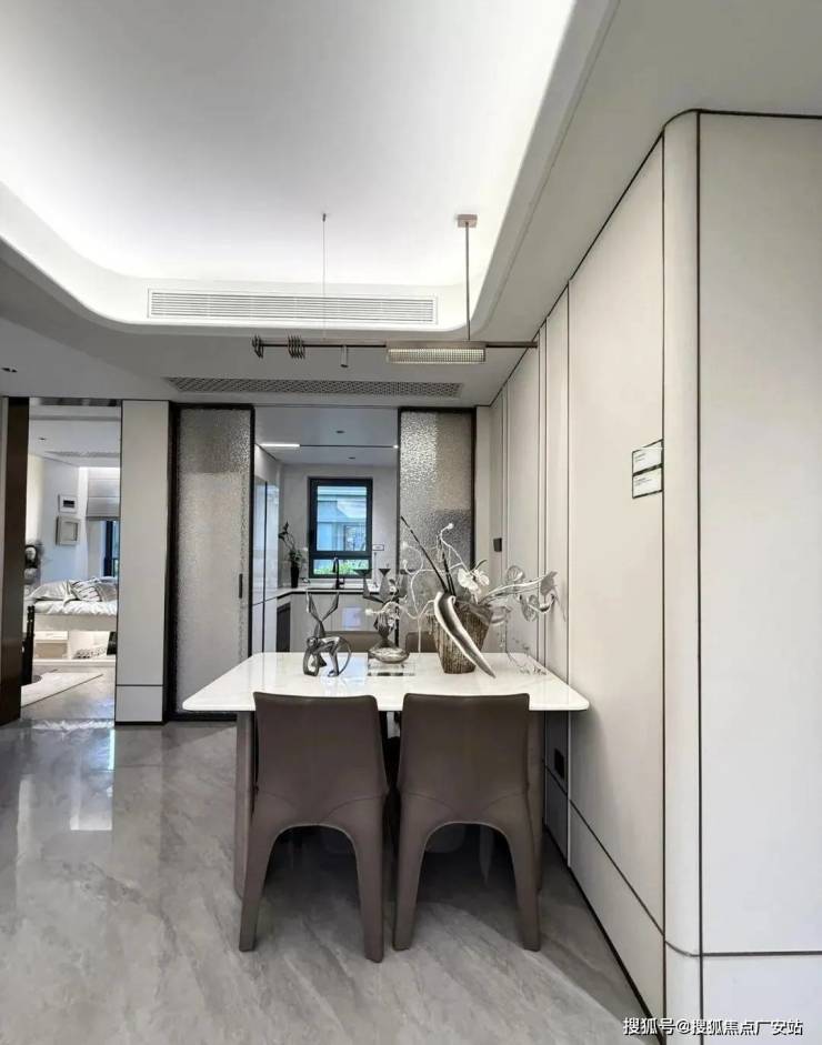 归家门厅设计为弧形顶棚,非对称构图,圆润的形式提供给业主放松的情绪价值。可以说是处处体现人居的松弛感和舒适度。
