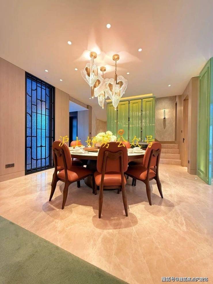 餐厅的设计巧妙融合了老上海的经典元素,圆形餐桌和橘色皮质餐椅在色彩上既现代又充满活力,顶部的水晶吊灯造型灵感来自上海市花“玉兰花”,既增添了空间的华丽感,又巧妙地融入了上海的地域特色。
