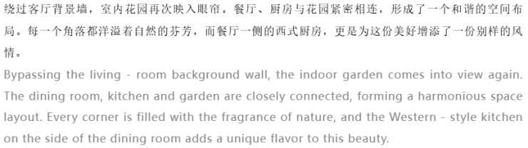 自古以来,庭院就是精神世界的入口,圈定一方心灵的净土。在屋檐之下,开放式吧台以咖啡色为基调,奢华与温馨相融,向庭院输送暖意。从波浪中抽象提取的瓦型纹,彰显于吧台、吊顶、室内等建筑部件,质感在肌理间流淌,吐露一种克制的优雅、极简的沉淀。