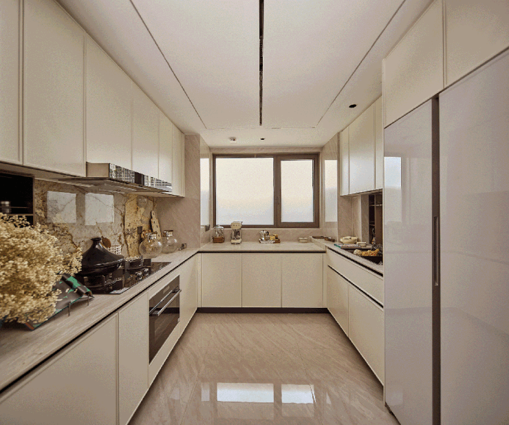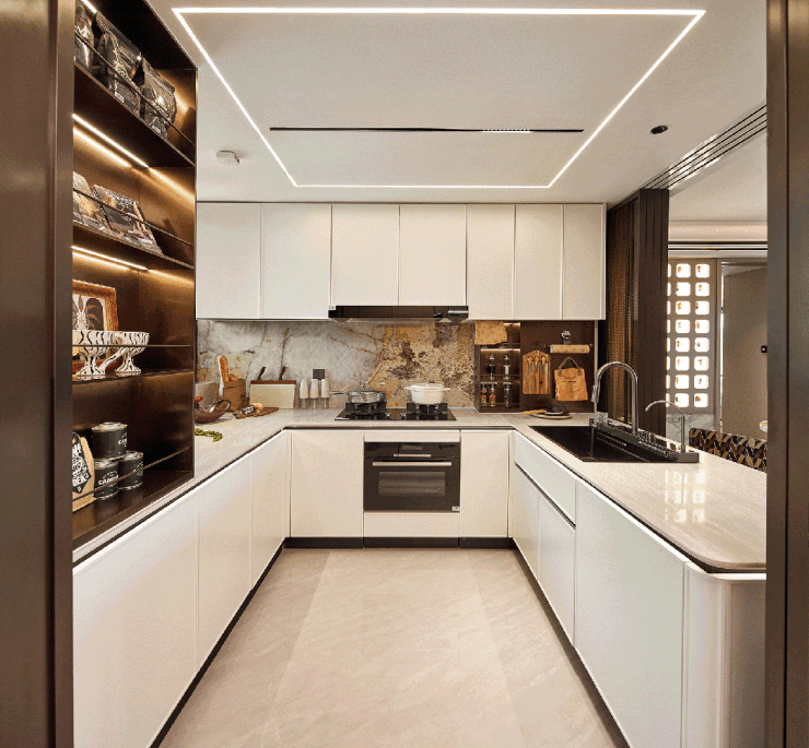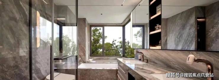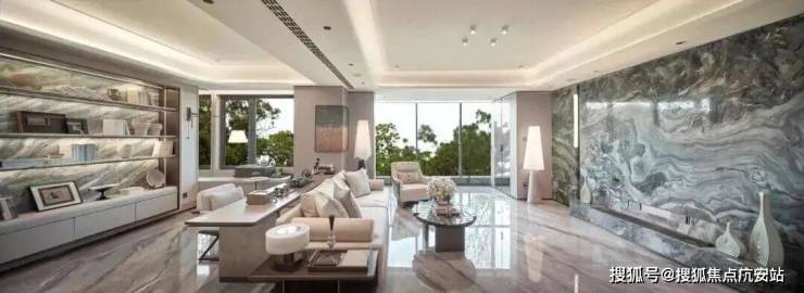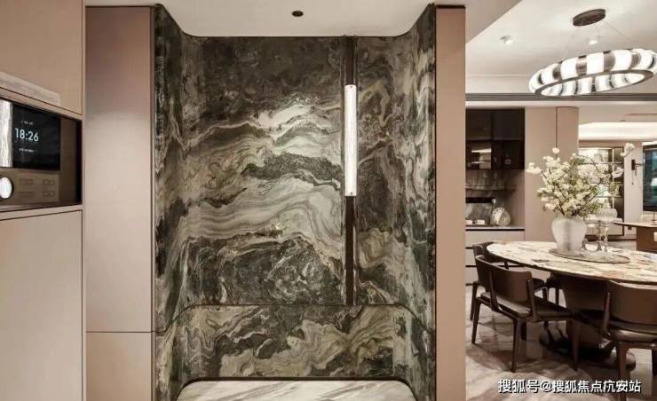 部分柜体更安全的圆角处理、高柜顶部一窥到底的镜面反光膜、大大提高空间利用的薄抽,不用弯腰一踢即开的踢脚抽设计,便利性大大增加。项目大量使用奢石设计,客厅四边弧形天花、主卧树叶拼花地板、精致优雅的骨骼线设计,都是开发商花费更大成本和耗材去呈现更美的视觉体验。