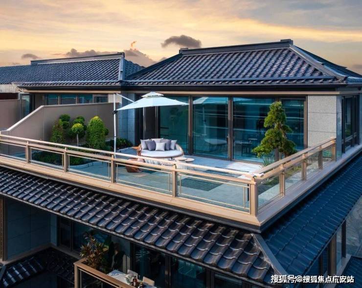 三重屋檐,代表天地人融合的东方宫殿最高等级,上檐、外檐、下檐三重结构,现代立面,以铝板、格栅、石材、瓦墙型材、玻璃等现代型材,彰显传世之宅的独特气度。