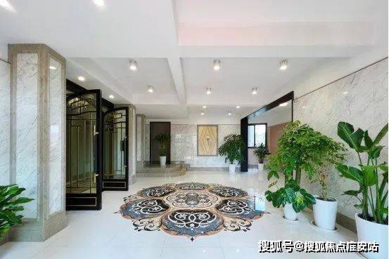 每栋楼都是地上地下双入户大堂的设计,一层入户大堂地面采用了曼陀罗拼花造型,而且都是纯手工切割技术打造的定制款,用材精细讲究。