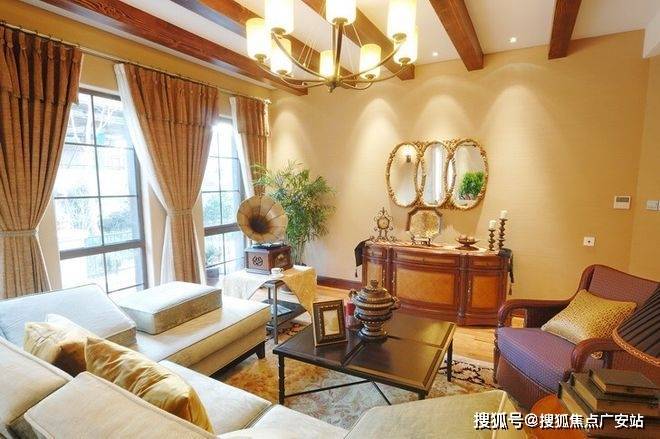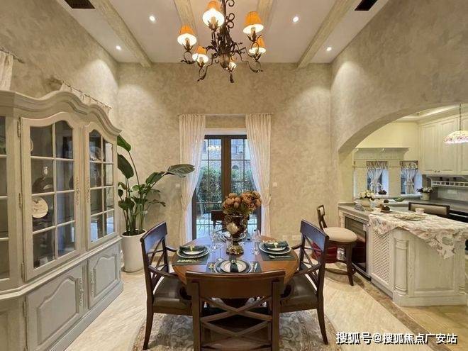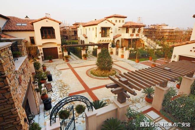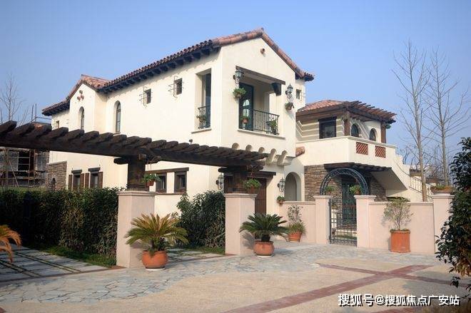 采用美国南加州的建筑风格,外立面采用淡黄色的手工Stucco抹灰外墙和红瓦屋顶,将原汁原味的南加州风格复制至此,同时融入原木、三色瓦片、红砖、铁艺、各式烟囱等元素,渗透一砖一瓦,仿佛置身异国小镇。