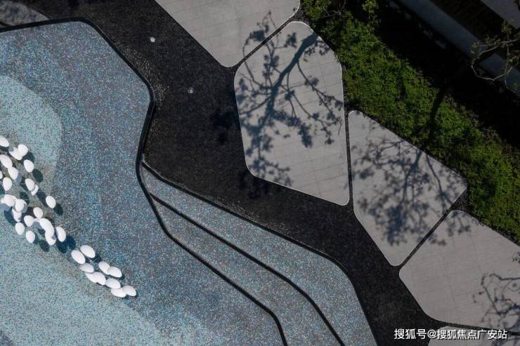 地面的步道提取礁石的形状,横卧在水面上,有凌波微步之势。