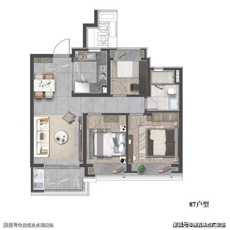建面约99㎡的三房设计,在空间上使用功能更加多样化,一站式解决了家庭生活的所有功能,优化居家动线,大大提升空间的居住体验。