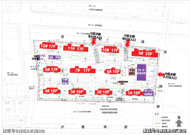 其中1号楼靠近17层的保障房,5号口为3层的配套用房;14#、15#为P站,16#为垃圾用房。