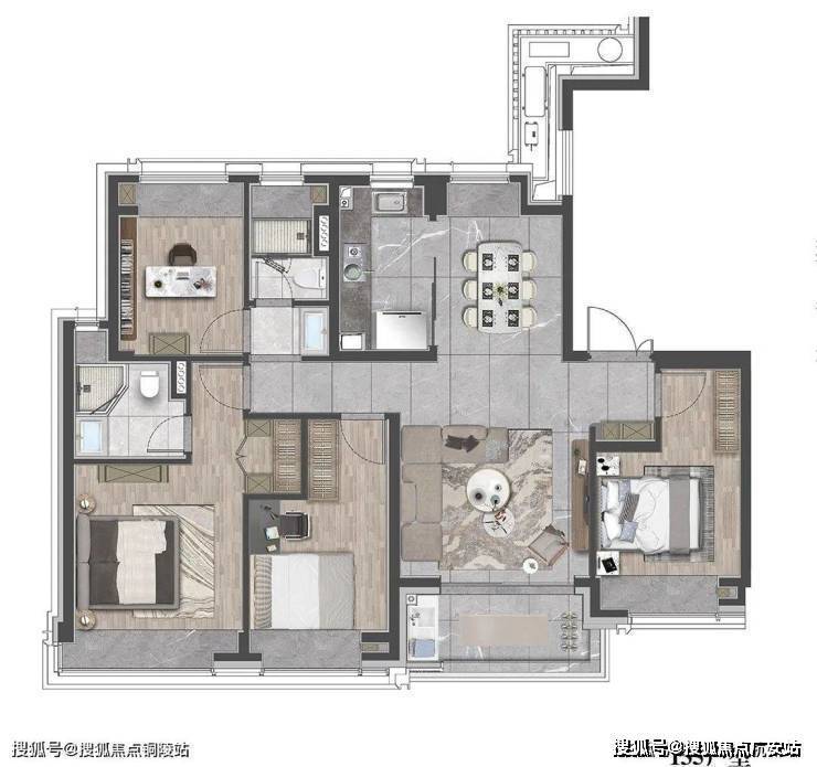 该户型贴合当代人居生活习惯,既适合三口之家小太阳家庭,也可以是三代同堂,每个人都能拥有独立空间。