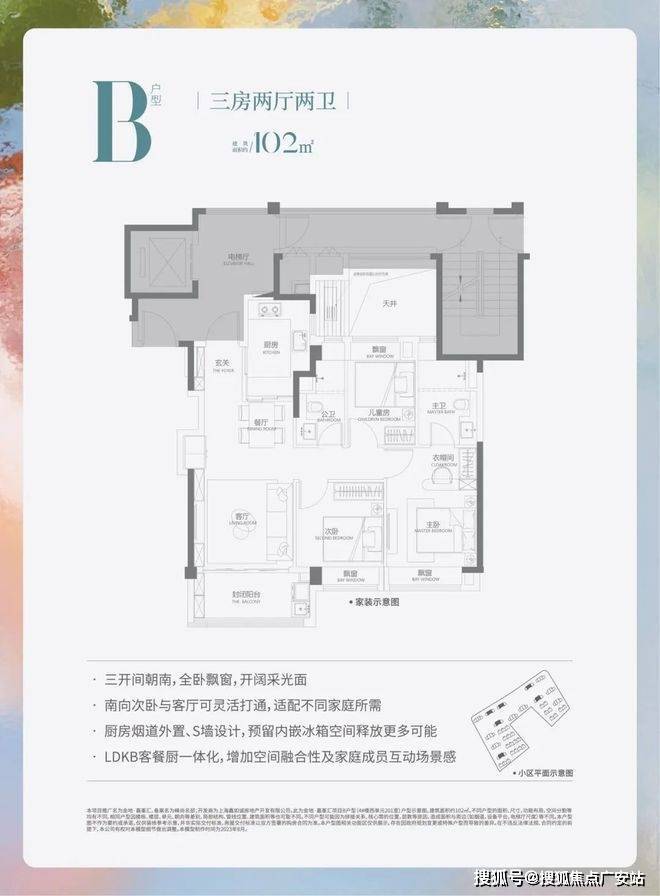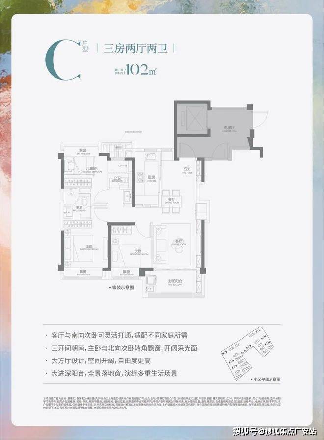 三开间朝南。拥有充分的采光。主卧及北卧室还带有L型飘窗,大进深阳台全景落地窗,优化采光,提升观景体验。