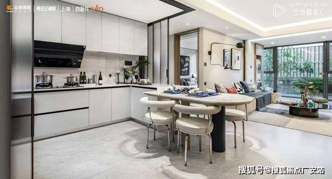 LDKB一体化设计。通过金属玻璃移门和岛台联动,达成餐厨一体,增加家庭成员互动。烟道外置以及S墙内嵌设计,优化空间布局,提升台面使用感和转角柜使用频率。