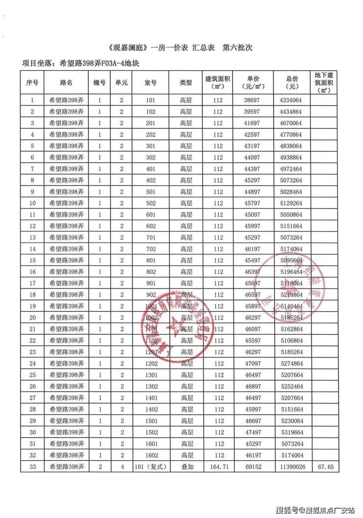 一房一价表如下: