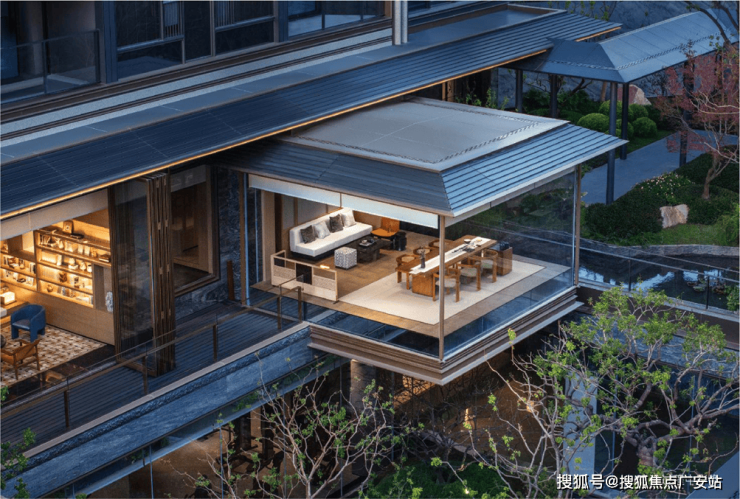 而最令人惊艳的,当属约6米地势差打造的下沉式山水庭院,山、石、水、林有序交织,犹如一幅“豁然开朗”山水轴卷,每一步皆是景致,每一处皆有不同。