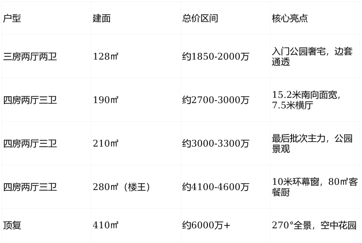 在售状态:三批次(3/6号楼)已开盘,128/210㎡为主力;高区公园景观房稀缺,需提前锁定