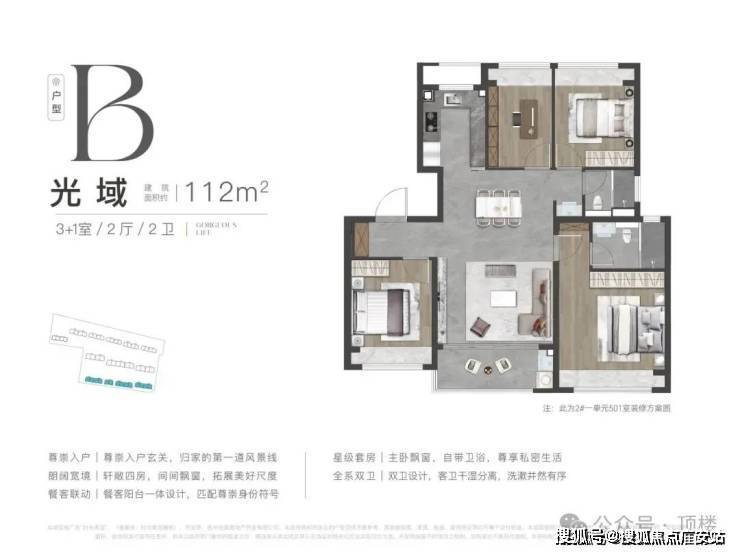 👉112㎡四房两卫:罕见“3+1”灵动空间,4飘窗+独立玄关,得房率82%,总价357万起;