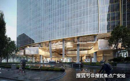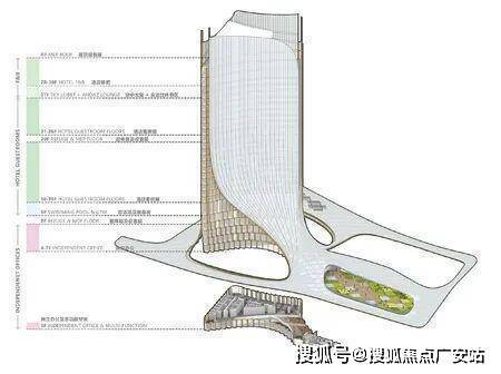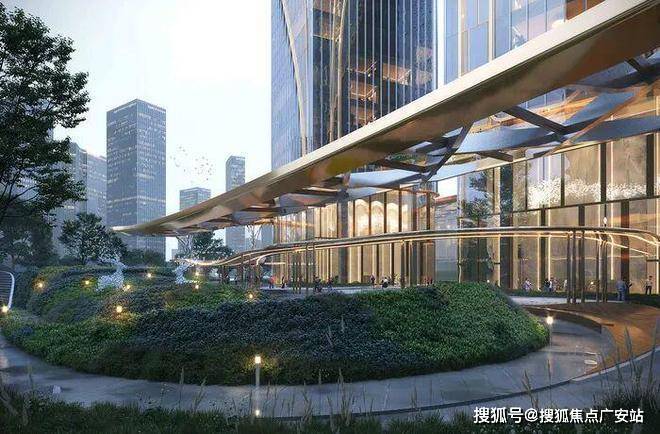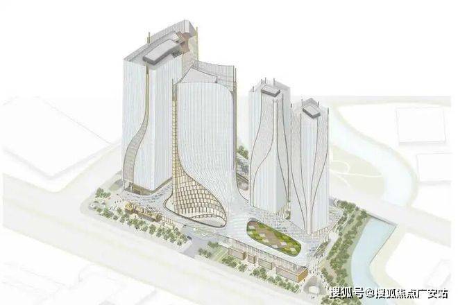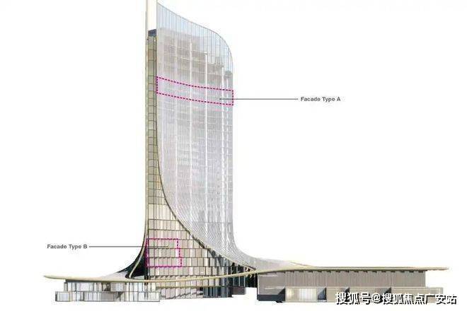 综合体的独特张力通过酒店塔楼立面上标志性的巨型玻璃天幕彰显,加强了创造开放姿态的建筑设计理念。巨型天幕沿着酒店塔楼立面顺流而下,在低区如双翼般展开形成弧面。这个水平弧面向4栋塔楼动态环绕后,塑造了各功能之间的链接纽带,并勾勒出内外部庭院的轮廓。