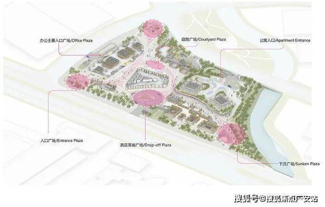 在UNStudio的设计中,场地设计呼应了城市规划轴线和景观轴线,确保4座140米的塔楼拥有无遮挡的朝江视角;进而在场地中心释放出的公共空间形成中央庭院、酒店广场与景观走廊,低层空间则如散落的盒子般围绕多用途的公共广场分布。这样的建筑布局不仅创造了开放的视野,并且在地面层形成可渗透的城市界面,四向开放,邀请世界游客进入场地中心,同时激活了整个社区。