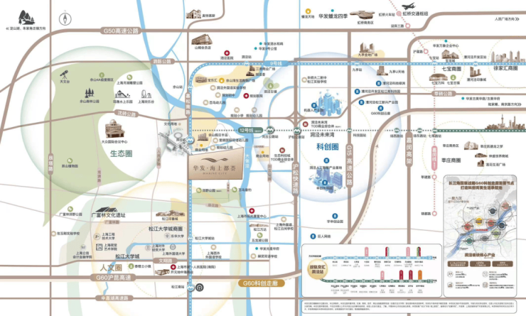 合心规划产城样板:【“科创+人文+生态”城市单元示范】华发海上都荟首入松江,携崭新“优+产品体系5.0”,为洞泾、乃至为松江带来目前区域内综合高品质作品。结合上海生态环境保护“十四五“规划,站位国际领先的可持续性项目规划,华发海上都荟结合自身的独特聚合优势,在传统TOD规划之上,不可复制的土地生态资源,向东链接G60科创走廊“以镇命名为区块”洞泾人工智能产业基地;向南直达亚洲大学城之一——松江大学城;北侧紧连上海陆面自然山林资源——佘山国家旅游度假区。板块将区域打造成为“科创+文教+生态”交汇的核心新城模式,划立一个崭新的城市单元示范。