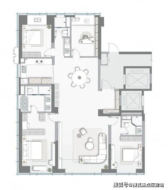 回归终改客户和资产配置客户的生活场景,项目在私密性和社交属性作出了重要表达,从细节着手革新产品设计标准,归家动线上打造出艺术地库光厅、一梯一户格局、隐奢会所、多场景架空层等人性化空间。