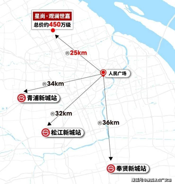 从地图上就可以很直观的看到,项目距离人民广场直线约25km,这个地段比6万均价的松江新城、5万均价的青浦新城和奉贤新城更好。