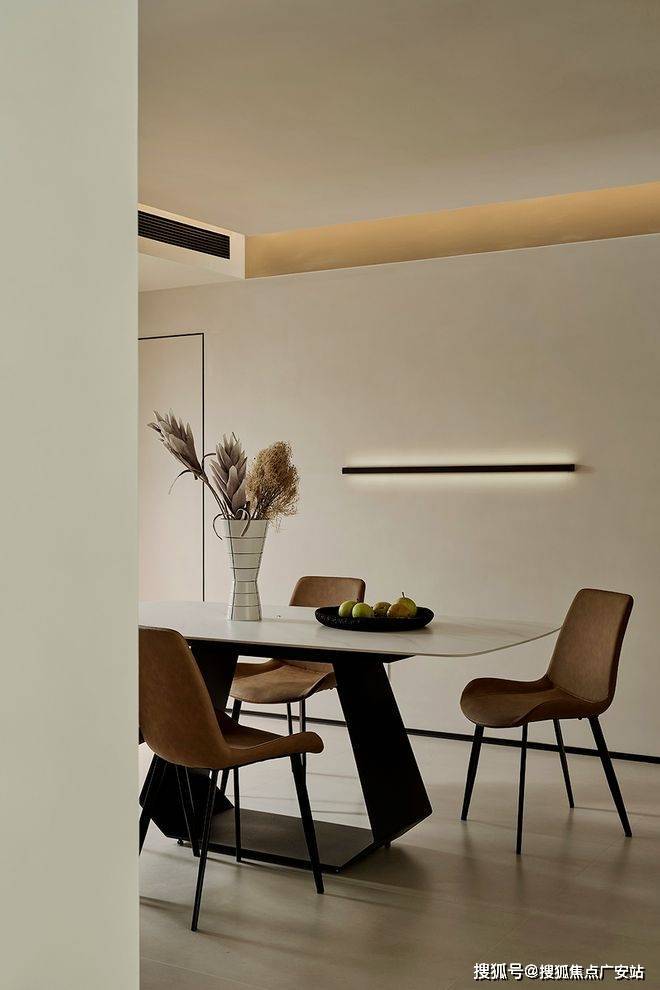 白色岩板餐桌,搭配驼色极简餐椅,形成冷暖碰撞的视觉焦点。整墙餐边柜浅灰色门板,简约又不失高雅,低调地融入空间。对面白墙增加了灯线点缀,使空间不至于空荡荡。