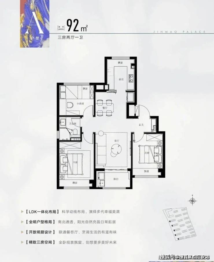 产品户型:92平三房两厅一卫、100平三房两厅两卫、135平四房两厅两卫、叠加