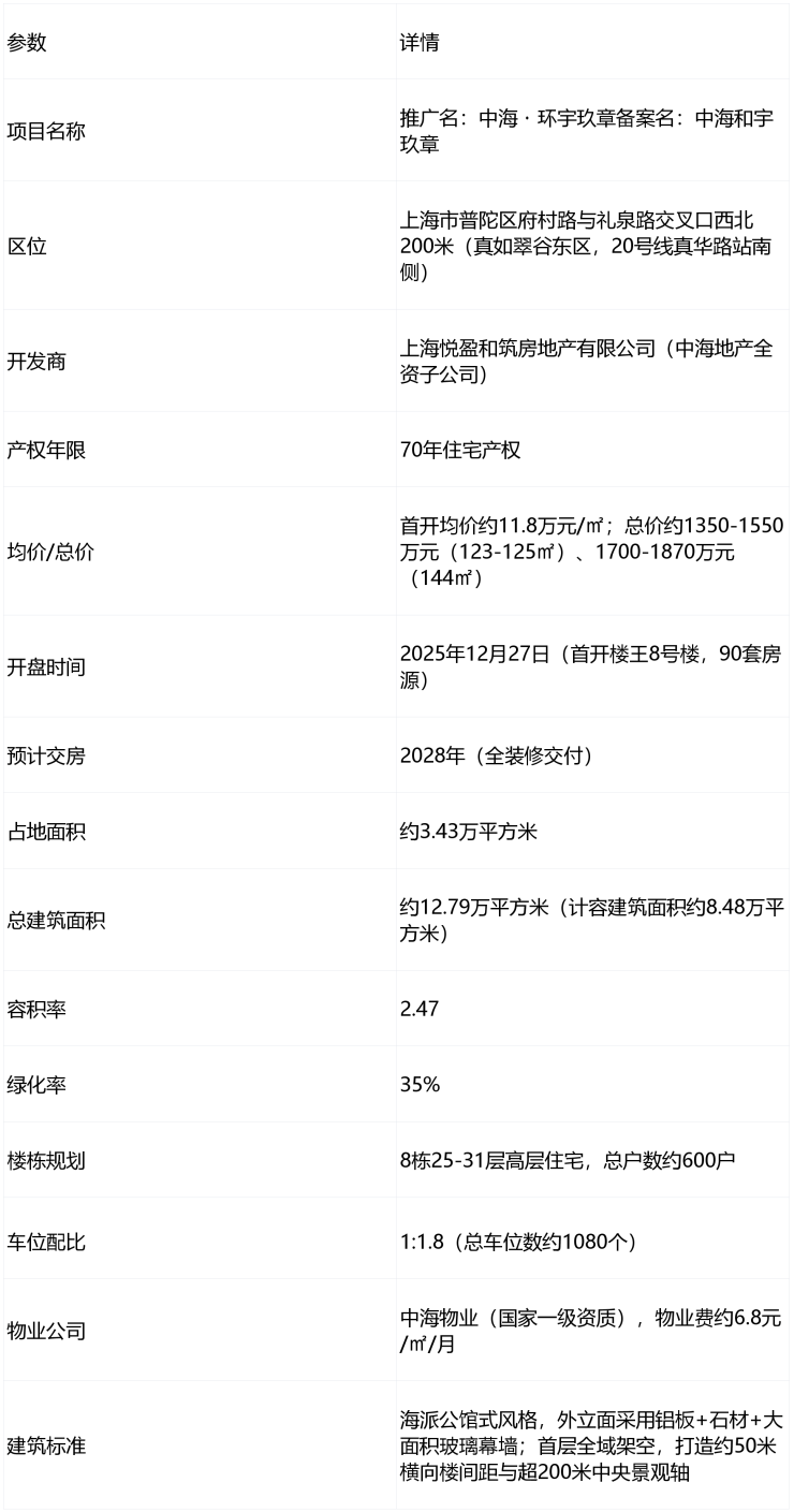 核心定位:中海上海"玖系"高端首入普陀标杆力作,真如城市副中心核心区TOD+EOD综合社区,内中环双核区位"五轨豪宅",主打建面约123-176㎡精装阔尺3-4房,首开均价约11.8万元/㎡,总价约1350-1870万元,适配全周期改善家庭