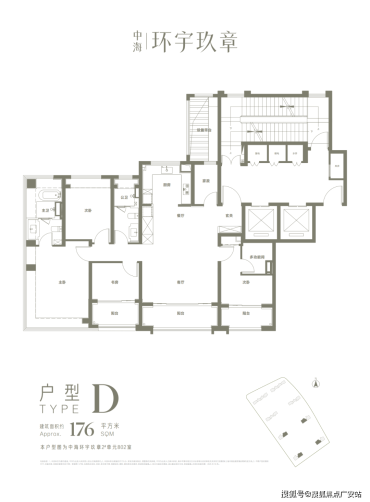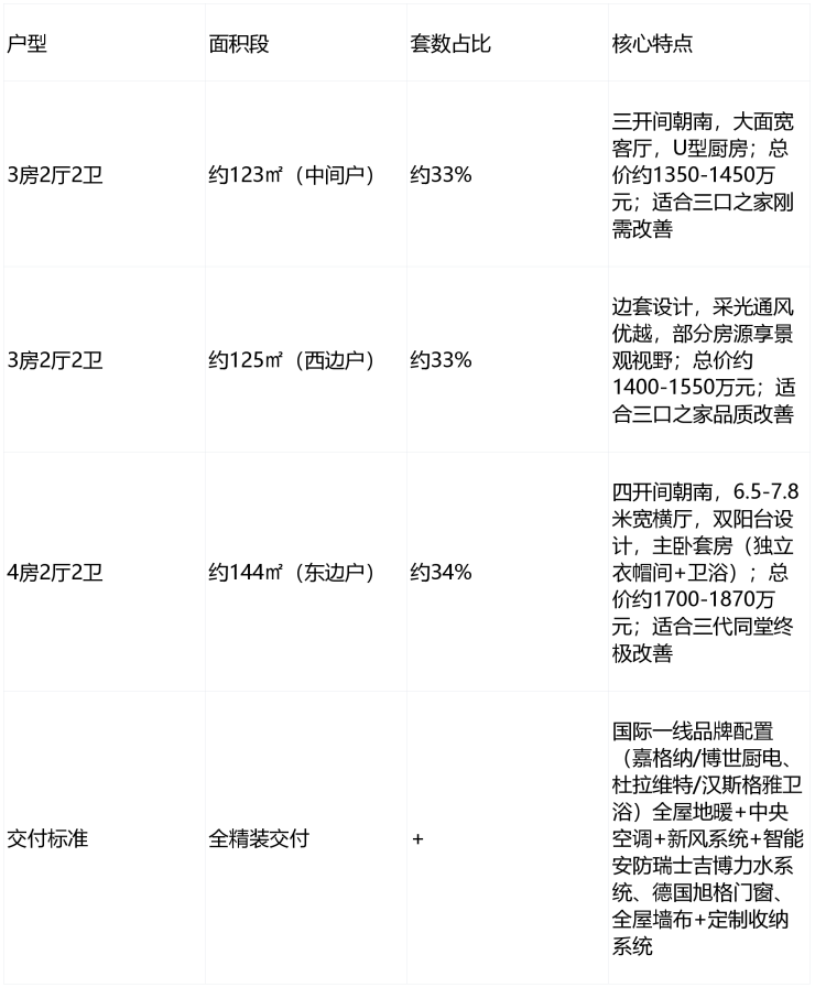 主力户型:建面约123-176㎡的3-4房精装阔尺住宅,两梯两户设计,独立玄关保障私密,得房率约78-82%,全精装交付,搭载中海"玖系"高端精装标准